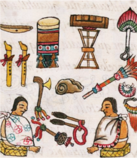 Existen al menos otros tres casos en los cuales se observan hachas doradas, enmangadas en cetros adornados con borlas de plumas de papagayo, llamados xaoactopilli (Códice Florentino, 1979: lib. IX, cap. 5, foja 19r). Uno de estos objetos se aprecia en relación con el coacalli o casa de cantores; posiblemente formaba parte de un instrumento utilizado para percutir los tambores, de acuerdo con la descripción asociada a la imagen.