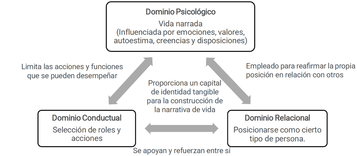 En esta investigación adoptamos la perspectiva del Modelo Triángulo de Identidad, propuesto por Dugas (2021), desde el cual se entiende la identidad docente como un proceso de interacción entre tres dominios: el psicológico, el conductual y el relacional (ver Figura 1). El dominio psicológico está dirigido a la historia de vida narrada por el futuro profesorado; el dominio conductual está orientado a los roles y acciones vinculados con el ejercicio de la profesión y, el dominio relacional se orienta a la postura que se adopta en relación con los otros y la percepción que tienen los otros sobre uno, lo que es ser reconocido como un profesor (Dugas, 2021).