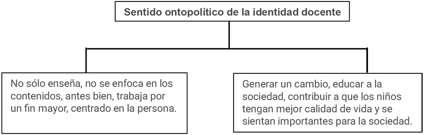 Se manifiesta un fuerte predominio de la identidad docente desde una perspectiva ontopolítica, en la cual la naturaleza de la identidad docente del profesorado de Educación Especial tiene una fuerte raigambre en el sentido político del ejercicio de esta profesión (Figura 3). Lo anterior queda reafirmado con la opinión de Mónica: