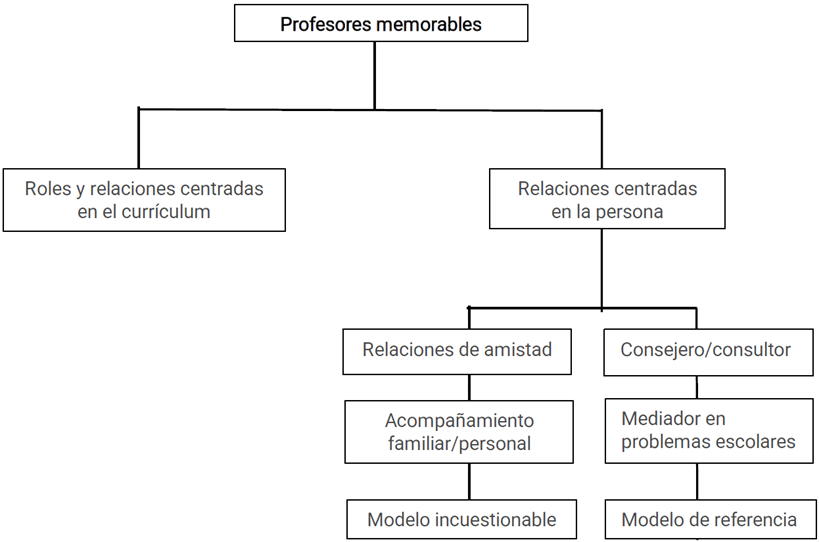 Los profesores memorables (ver Figura 6) abarcan un amplio espectro de relaciones con la figura docente, los que van desde tener familiares que ejercen la docencia en diversas áreas, hasta la relación que se establece con los profesores universitarios durante la formación inicial docente. Al respecto, Mónica señala: