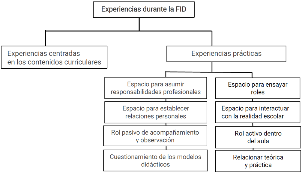 Las experiencias durante la formación inicial docente (FID) son una fuente para el desarrollo de las RS sobre identidad del profesorado y la construcción de la propia identidad docente. Se ha identificado, a partir de los discursos, que una experiencia que contribuye de manera significativa en estos procesos son las instancias prácticas en todos sus niveles. El eje de significación lo constituyen las experiencias durante la FID (Figura 7).