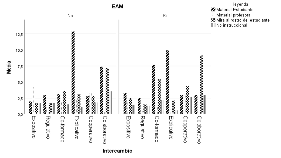 Por otro lado, la Figura 1 muestra que la distribución de las áreas de fijación de la mirada tiende a ser similar entre los seis tipos de intercambio con y sin criterio EAM. Mirar el material del estudiante es mayor en el intercambio Explicativo, independiente de que haya o no presencia de criterio EAM. En tanto que el tiempo para mirar al rostro de los estudiantes es mayor en los intercambios Colaborativos, especialmente en aquellos que tienen presencia de criterio EAM. El tiempo de fijación de la mirada en el material de la profesora es mayor en los intercambios Expositivos sin presencia de criterio EAM.