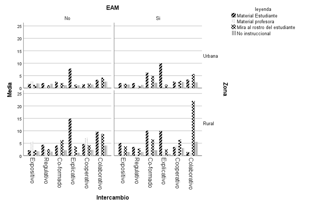 La Tabla 4 muestra que, independiente de la zona (urbana o rural), en los intercambios Expositivos el profesorado tiende a mirar más tiempo su propio material de trabajo (MTP: pizarra, libro, materiales de demostración), y no emplear criterios de Experiencia de Aprendizaje Mediado (EAM) en sus intervenciones. Independiente de la zona, el profesorado tiende a mirar más el material de los estudiantes (MTE: cuadernos, material de trabajo) en los intercambios Regulativos sin intervenir con criterios EAM. En el profesorado urbano el tiempo para mirar el material de los estudiantes aumenta en los intercambios Co-formados y Explicativos con uso de criterios EAM, y en el profesorado de aula rural esto es así sólo en los intercambios Co-formados.