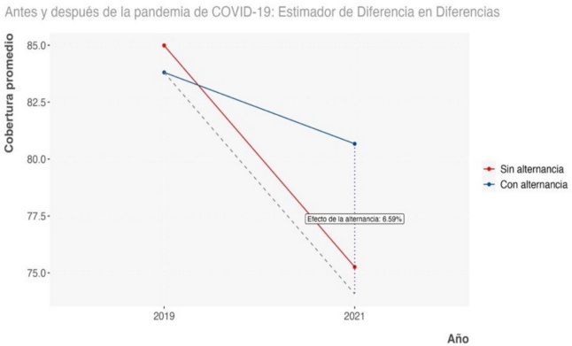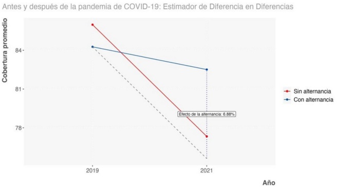 En la figura 4 se muestra una visualización del efecto causal de la alternancia en la cobertura de agua potable. La línea roja representa los niveles de cobertura promedio de agua potable para 2019 y 2021 para gobiernos sin alternancia. La línea azul muestra la misma dinámica, pero para gobiernos con alternancia. Asimismo, se presenta una línea entrecortada que surge del primer punto de la línea azul en 2019 y llega hasta 2021. Esta línea entrecortada representa una tendencia paralela, es lo que se espera que hubiera ocurrido en ausencia de tratamiento. En este caso, representa los valores de cobertura de agua potable a un nivel contrafactual, asumiendo que la dinámica anterior permanecería constante. Por último, la gráfica muestra una línea punteada que mide la distancia entre el valor contrafactual, que es por definición hipotético, y un valor realmente observado. El valor contrafactual corresponde al nivel de cobertura de agua potable en 2021 que se hubiera observado en ausencia de alternancia. Por su parte, el punto donde termina la línea azul en 2021 sí fue observado y corresponde al nivel de cobertura de agua potable para gobiernos de alternancia. Esta distancia corresponde al efecto causal estimado por el Modelo1 de 6.59 %.