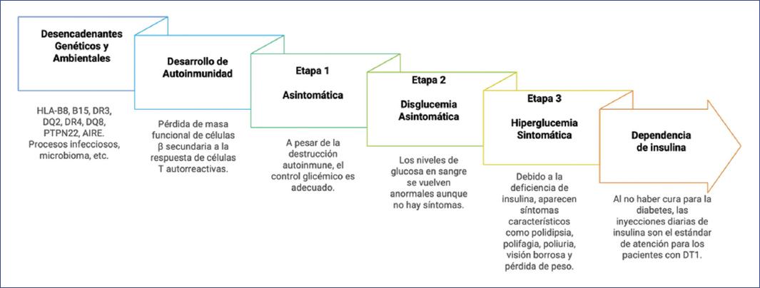 El dato fisiopatológico principal de la DT1 es la pérdida de masa funcional de células beta en los islotes pancreáticos de Langerhans, secundaria a la presentación de autoantígenos por parte de las células presentadoras de antígeno (principalmente células dendríticas) a los linfocitos TCD4+, lo que induce la formación de linfocitos TCD4+ y CD8+ autorreactivos que provocan daño celular tras la activación de macrófagos por parte de las células Th1, la secreción de citocinas y quimiocinas que amplifican el estado inflamatorio y la secreción de gránulos citotóxicos (granzimas y perforinas), así como la secreción de citocinas y la inducción de apoptosis por vía de la expresión de Fas, aunado a una disminución de la actividad de los linfocitos reguladores, lo que favorece un ambiente inflamatorio crónico en los islotes. En la etapa 1 de la enfermedad también se encuentran autoanticuerpos contra antígenos de los islotes pancreáticos, como aquellos dirigidos contra la insulina, GAD65, IA-2, ZnT8, los anticuerpos de las células de los islotes no específicos, el pancreático duodenal 1 (PDX1), la cromogranina A (CgA), la proteína de choque térmico 60 (HSP60) y el antígeno de las células de los islotes 69 (ICA69)14. Sin embargo, se desconoce el punto de origen de estos anticuerpos como reflejo de la presentación de autoantígenos a las células T CD4+ y CD8+ específicas15.