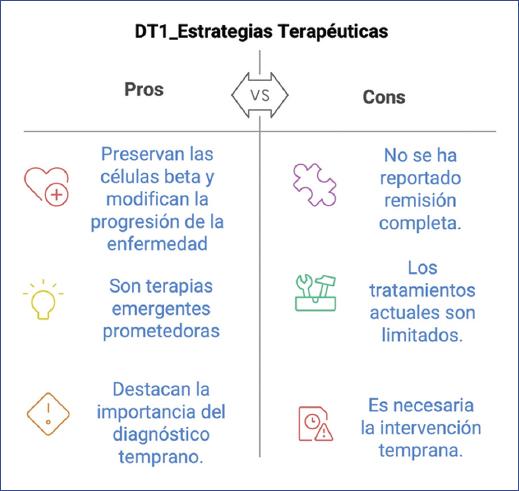 El abordaje inmunológico de la DT1 resulta prometedor en relación con sus pocos riesgos, aunque se debe continuar explorando y desarrollando vías de tolerancia inmunitaria. Se requiere más investigación para conocer cómo modular la respuesta inmunitaria y generar áreas de desarrollo de estas terapias.