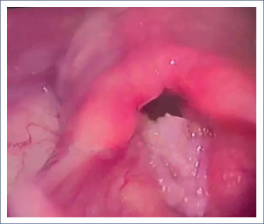 Figura 1 Laringoscopia diagnóstica en paciente de sexo masculino de 7 años que muestra lesiones exofíticas papilomatosas aperladas dependientes de ambas cuerdas vocales y comisura anterior.