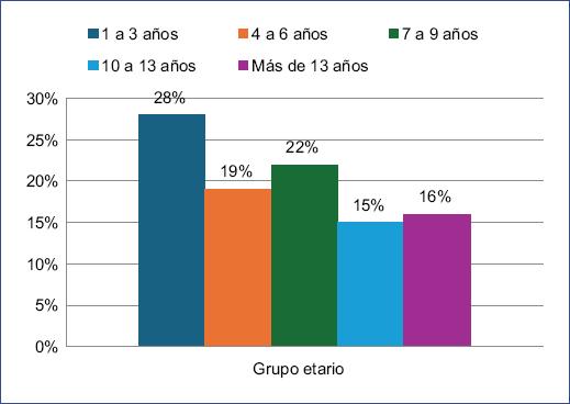 Para evaluar la asociación del genotipo, así como la carga viral del VPH, con la gravedad de la papilomatosis laríngea en la población de pacientes pediátricos se estudiaron 32 pacientes. El 69% de los participantes fueron de sexo masculino y el 31% del femenino. La edad promedio fue de 7 años, con un rango de edad mínima de 1 año y máximo de 16 años, siendo el grupo etario más frecuente el de 1 a 3 años en el 28% (Fig. 2).