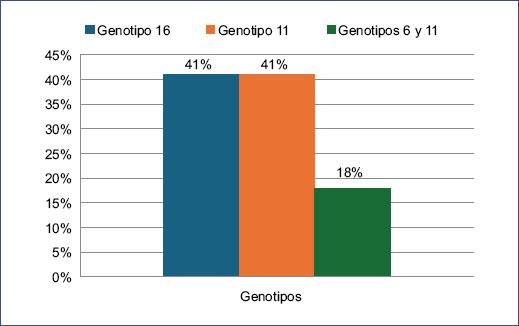 En nuestro trabajo la frecuencia de genotipos fue del 41%, tanto para genotipo 6 como para genotipo 11; Pavinee y Sonsuwan20 obtuvieron el 40% de genotipo de VPH-6 y el 60% de VPH-11. No se encontró coinfección entre VPH 6 y 11, mientras que en nuestro caso la tasa fue del 18%.