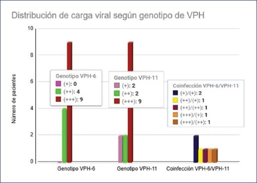 La prevalencia de genotipo en el estudio se distribuyó de la siguiente manera: un 41% (13 pacientes) fueron positivos a genotipo VPH-6, al igual que el genotipo 11; mientras que la presencia de ambos genotipos en coinfección se reportó en un 18% (6 pacientes) de la población (Fig. 3). En relación con la carga viral, se encontró que la mayoría de los pacientes (69%) positivos a cada genotipo presentó una carga elevada (+++) tanto en el grupo de VPH-6 como en el de VPH-11, mientras que los pacientes que presentaron coinfección por ambos genotipos presentaron una carga viral variable, pero siendo más predominante la carga del genotipo 6 sobre el 11 (Fig. 4).
