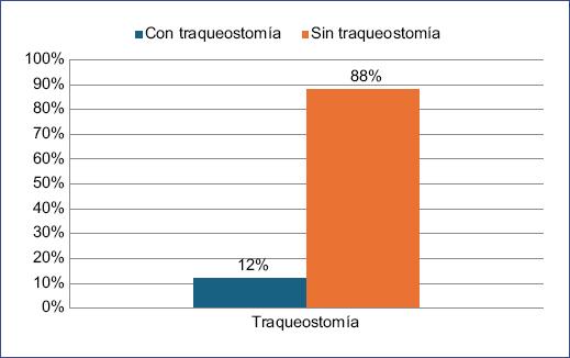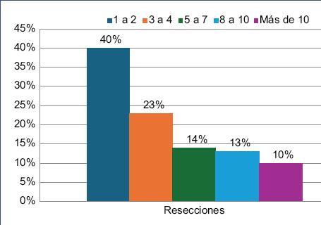 Solo el 12% de los pacientes requirieron la realización de traqueostomía (Fig. 5). El promedio de resecciones realizadas en los pacientes incorporados al estudio fue cinco; el 40% de los pacientes tuvieron de una a dos resecciones, el 23% de tres a cuatro procedimientos y solo el 10% necesitaron más de 10 resecciones (Fig. 6).