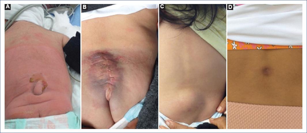 Figura 1 Se muestran los estigmas cutáneos identificados en algunos pacientes. A: cola humana. B: hemangioma cutáneo en paciente operado de mielomeningocele. C: lipoma subcutáneo en paciente con lipomielomeningocele. D: hoyuelo cutáneo en paciente con seno dérmico.