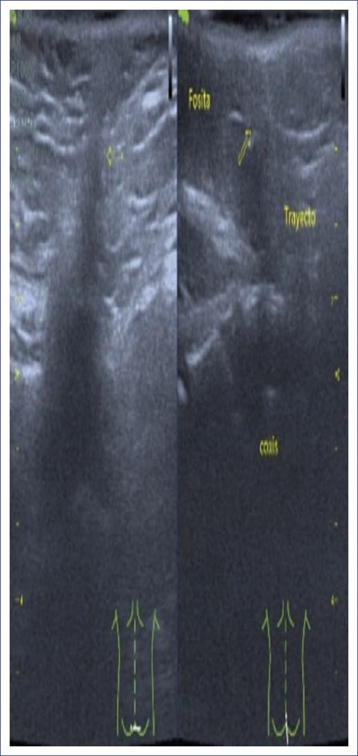 Figura 2 Ultrasonido en paciente de 18 meses con hoyuelo dérmico, sugiriendo un trayecto fistuloso. Se complementó el diagnóstico con resonancia magnética, identificando un seno dérmico lumbosacro. Las flechas amarillas muestran el trayecto del seno dérmico y las imágenes insertadas inferiormente, demuestran la posición del transductor del ultrasonido sobre el paciente.