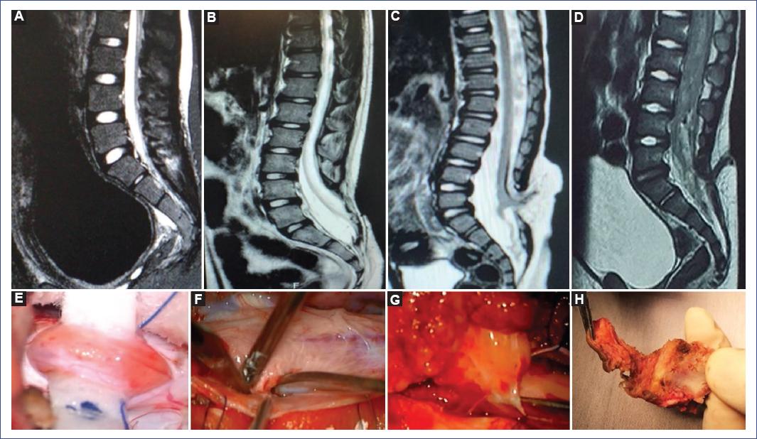 Figura 3 Imágenes de resonancia magnética en secuencia T1 en corte sagital en la parte superior y en la parte inferior imágenes intraoperatorias (A y E). Filum lipomatoso y megavejiga en resonancia magnética (B y F). Paciente operado de mielomeningocele con la medula anclada a la duramadre (C y G). Lipomielomeningocele con médula que se ancla al lipoma (D y H). Seno dérmico y trayecto del seno dérmico que atraviesa la vértebra, se evidencia la vejiga incrementada de tamaño en la resonancia magnética.