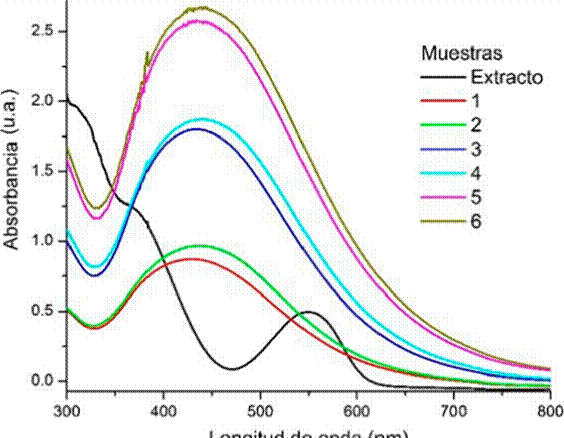 Es importante destacar que, de acuerdo con la coloración obtenida del extracto, además de tomar en cuenta lo reportado por Hernandez-Martinez et al. en el 2011, donde ellos usando extractos acuosos de B. spectabilis les fue posible extraer betacianinas, lo que sugiere que es muy probable que en el proceso de extracción se obtuvieran estos componentes, los cuales son solubles en agua además de que presentan una coloración entre rojo-violeta, dependiendo del pH al que se encuentren. Asimismo, los autores mencionan que las betacianinas extraídas presentan picos máximos de absorbancia máxima en su espectro de UV-Vis aproximadamente en 535 nm, algo que en el espectro del extracto inicial se observa con un pico de absorción entre los 530 y 550 nm (Figura 1), y al pasar el tiempo esta banda desaparece completamente dando origen a las bandas de NP’s-Ag, lo que sugiere significativamente que estas biomoléculas tienen también un papel importante en el proceso de síntesis de dichas NP´s.