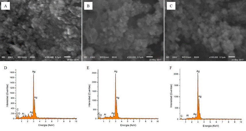 A través de las micrografías capturadas con el MEB, se confirmó la presencia de las NP’s sintetizadas. En la Figura 2, se presentan las micrografías representativas de la síntesis, donde se aprecian aglomerados de partículas con dimensiones nanométricas, oscilando entre los 30 nm y 60 nm. Estas partículas exhiben una morfología cuasi esférica en todos los cuadrantes analizados. Por otro lado, los análisis de los EDS realizados en todas las muestras de las NP’s-Ag indican que la plata es el elemento principal constituyente de estos aglomerados, seguido por carbono (C) y oxígeno (O) como elementos secundarios. La presencia de C y O puede atribuirse a restos del medio de síntesis o a compuestos funcionalizantes adheridos en la superficie de las partículas.
