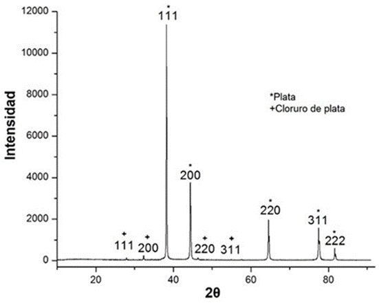 Por medio de la técnica de DRX se obtuvo el patrón de difracción mostrado en la Figura 3, siendo el patrón de difracción principal la plata (JCPDS card No. 65-2871) con picos máximos en 38.107° (111), 44.29° (200), 64.43° (220), 77.38° (311) y 81.52° (222) y unos pequeños picos debido al cloruro de plata (JCPDS card No. 31-1238) en 27.803° (111), 32.213° (200), 46.20° (220) y 54.78° (311) los cuales, aparecen de acuerdo con los patrones de difracción indexados en el equipo. Se determinó el parámetro de red para la fase de Ag 4.086 Å y la fase de AgCl de 5.552 Å, ambos correspondientes al grupo espacial F M -3 M (No. 225). De acuerdo con la ecuación de Scherrer aplicada a los resultados obtenidos el tamaño de cristalito para la fase de Ag es de 30.77 nm y de 64.27 nm para la fase de AgCl.