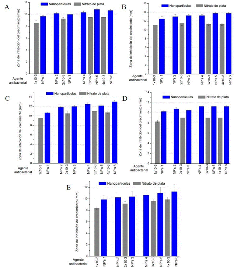 Figure. 4 Graphs of the growth inhibition zones for the silver nanoparticle and silver nitrate sample in A) S. aureus clinical isolate, B) K. pneumoniae ATCC, C) P. aeruginosa clinical isolate, D) E. coli clinical isolate and E) S. aureus ATCC. Nanoparticle=NP´s1, NP´s2, NP´s3, NP´s4, NP´s5 y NP´s6.