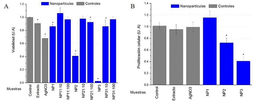 En las pruebas de proliferación, se obtuvo que las NP1 (1.15, ± 0.11) aumentaron significativamente la actividad mitocondrial (proliferación celular), mientras que su contraparte los iones de plata la disminuyeron ligeramente, siendo las muestras NP2 (0.72, ± 0.078) y NP3 (0.409, ± 0.071) las que disminuyeron la actividad mitocondrial en mayor medida y con significancia estadística al compararse al control. Cabe señalar que la muestra NP3 tuvo una diferencia significativa con respeto al extracto en la disminución de la actividad mitocondrial (Figura 6B).