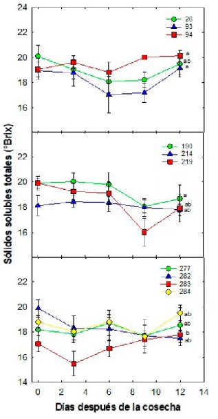 Figure 1: Total soluble solids dynamics (°Brix) during postharvest of mangosteen selections in Tuxtla Chico, Chiapas. Each point represents the mean of five repetitions and its standard error. Different letters for each ecotype indicate significant differences according to the Tukey test (0.05); the symbolism expressed by colored figures and numbers represents the selecctions.