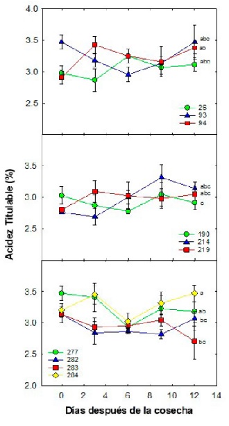 Figure 2: Titratable acidity dynamics (%) during postharvest of mangosteen selections in Tuxtla Chico, Chiapas. Each point represents the mean of five repetitions and its standard error. Different letters between each ecotype indicate significant differences according to the Tukey test (0.05); the symbolism expressed by colored figures and numbers represents the selecctions.