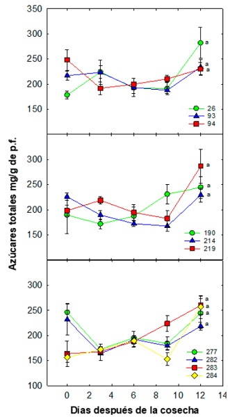 Figura 3 Dinámica de azúcares totales (mg/g de p.f.) durante la maduración de selecciones de mangostán en Tuxtla Chico, Chiapas. Cada punto representa la media de cinco repeticiones y su error estándar. Letras diferentes entre cada ecotipo indican diferencias significativas de acuerdo con la prueba de Tukey (0.05); la simbología expresada por figuras de colores y números representan a las selecciones.