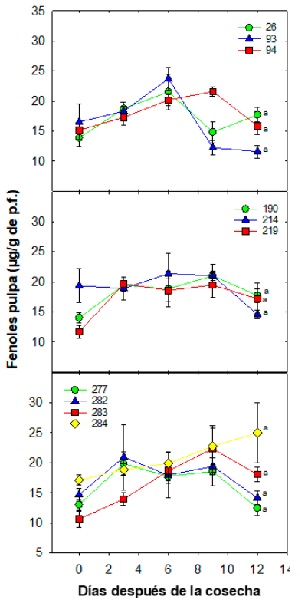 Figure 4: Pulp phenols dynamics (µg/g of f.w.) during postharvest of mangosteen selections in Tuxtla Chico, Chiapas. Each point represents the mean of five repetitions and its standard error. Different letters between each ecotype indicate significant differences according to the Tukey test (0.05); the symbolism expressed by colored figures and numbers represents the selecctions.