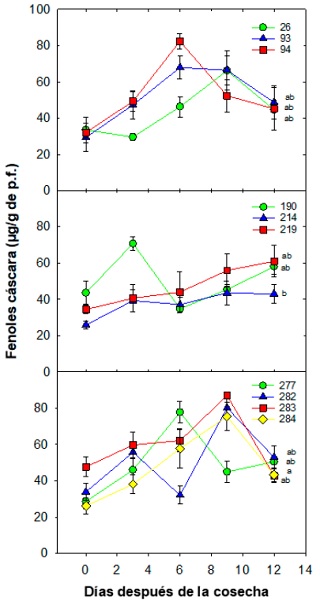 Figura 5 Dinámica de compuestos fenólicos en cáscara (µg/g de p.f.) durante la poscosecha de selecciones de mangostán en Tuxtla Chico, Chiapas. Cada punto representa la media de cinco repeticiones y su error estándar. Letras diferentes entre cada ecotipo indican diferencias significativas de acuerdo con la prueba de Tukey (0.05); la simbología expresada por figuras de colores y números representan a las selecciones.