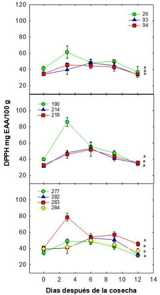 Figure 6: Antioxidant activity evaluated by DPPH during postharvest of mangosteen selections in Tuxtla Chico, Chiapas. Each point represents the mean of five repetitions and its standard error. Different letters between each ecotype indicate significant differences according to the Tukey test (0.05); the symbolism expressed by colored figures and numbers represents the selecctions.