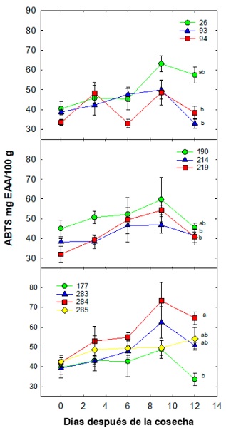 Figure 7: ABTS dynamics (mg EAA/100 g) during postharvest of mangosteen selections in Tuxtla Chico, Chiapas. Each point represents the mean of five repetitions and its standard error. Different letters between each ecotype indicate significant differences according to the Tukey test (0.05); the symbolism expressed by colored figures and numbers represents the selecctions.