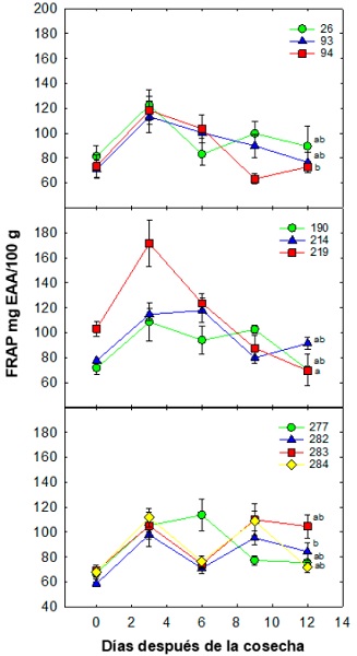 Figure 8: FRAP dynamics (mg EAA/100 g) during postharvest of mangosteen selections in Tuxtla Chico, Chiapas. Each point represents the mean of five repetitions and its standard error. Different letters between each ecotype indicate significant differences according to the Tukey test (0.05); the symbolism expressed by colored figures and numbers represents the selecctions.
