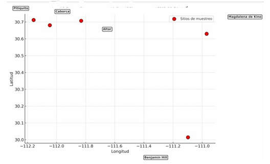 Tabla 1 Distribución de muestras por localidad, coordenadas y condiciones ambientales. Datos recopilados entre marzo y mayo de 2022 en el oeste de Sonora.