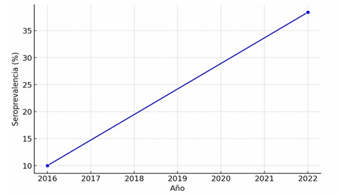 Los resultados obtenidos evidencian una seroprevalencia del 38.4 %, lo que representa una cifra superior a la reportada en estudios anteriores en la región (Núñez, 2016), reportando una prevalencia de 10 %, donde también utilizó la técnica de inmunodifusión en agar gel (AGID), pero no detalló los criterios de inclusión, transporte ni procesamiento, limitando parcialmente la comparabilidad directa de resultados (Figura 2). Este valor representa una seroprevalencia superior a la reportada en Veracruz (23.67 %) y Puebla (13.12 %), lo que sugiere una mayor circulación viral en el oeste de Sonora durante el periodo evaluado (Sánchez-Contreras et al., 2018), aunque se debe considerar la diferencia en metodologías y años de muestreo (Vallejo-Romero et al., 2021).