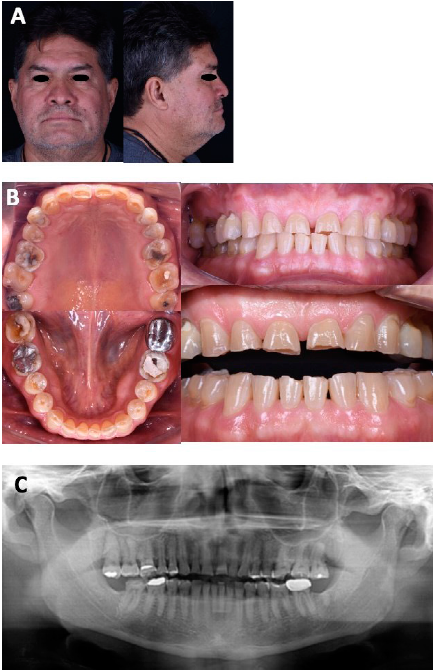 Paciente masculino de 60 años, su motivo de consulta: “Necesito muchos arreglos”, refierió ser diabético tipo II, con tratamiento de metformina. En el análisis extraoral presentó un biotipo facial mesocefálico. La línea interpupilar coincide con la línea intercomisural. La línea media facial mostró armonía. El tercio facial superior se encuentra disminuido mientras que el tercio medio e inferior son equivalentes. El tercio facial inferior, es dos veces mayor que el tercio superior y son simétricos, lo cual cumple con la norma de valores de análisis estético (Tabla 1; Figura 1 A). El paciente presenta bruxismo del sueño y de vigilia con etiología multifactorial.