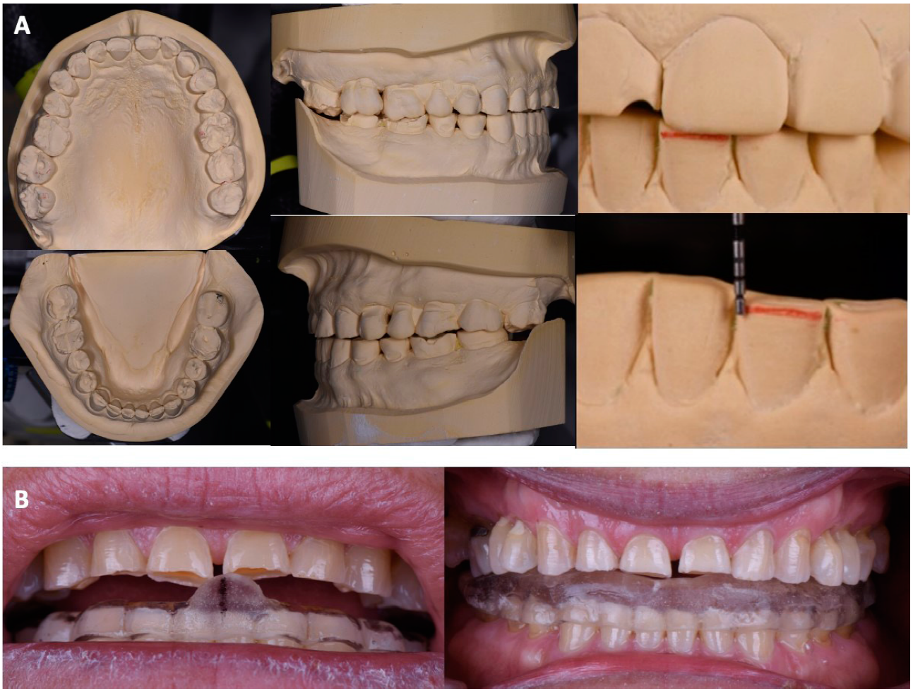 Figura 2 Análisis de los modelos y férula oclusal A. Análisis de los modelos, sobremordida vertical u oclusal (clasificación molar y canina). B. Procedimiento de fabricación de férula oclusal de 3.5mm para determinar adaptación a la nueva dimensión vertical de oclusión.