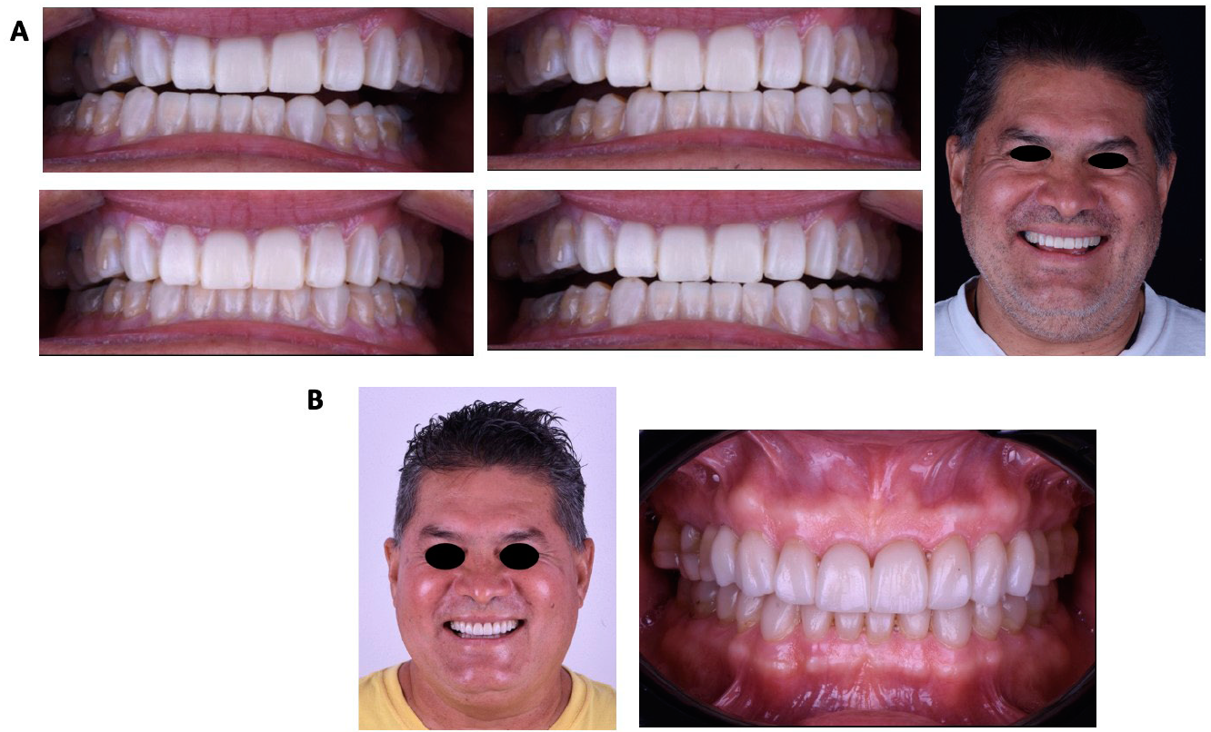 Mediante el encerado de diagnóstico, se optó por aumentar 3.5 la DVO en el vástago del articulador, propiciando un espacio adecuado para el material restaurador y dejando un espacio libre interoclusal de 1.5mm. Posteriormente se realizó una férula oclusal con 3.5mm de altura (Figura 2B), el paciente la utilizó durante 3 meses. Se comenzó retirando restauraciones defectuosas y lesiones cariosas (Figura 3A) en las cuales se colocó resin coating, para lo cual se utilizó grabado selectivo, adhesivo autoacondicionante (Single Bond 3MTM Espe, Alemania) y resina fluida (Filtek Z350 XT 3MTM Espe, Alemania) (Figura 3B). Una vez que el paciente confirmó la adaptación a la nueva DVO se procedió a probar el encerado en boca mediante un mock up (Protemp 3MTM Espe, Alemania), donde se evaluó: estética, fonética, plano oclusal, corredores bucales, oclusión, desoclusiones anteriores y aceptación del paciente (Figura 4A). Finalmente se procedió a la preparación de los dientes por medio de la maqueta pronóstica basada en el encerado para evitar desgastar más las piezas y preservando el espacio para el material restaurador. Las preparaciones consistieron en una corona completa del diente 37 con terminación en filo de cuchillo, carillas oclusales con biseles largos en los dientes 17, 16, 15, 25, 26, 27, 36, 46 y 47, vonlays en 14, 24, 35, 34, 44 y 45 así como carillas vestibulares en dientes anteriores mandibulares y preparación vertical de corona completa en dientes anteriores maxilares. Todas las restauraciones fueron elaboradas con e-max® Press High Transulcent (Ivoclar, Vivadent, Schaan, Liechtenstein) con técnica “Cut Back” en Carillas vestibulares y vonlays mientras que el resto de las restauraciones fueron maquilladas. Al momento de la cementación las carillas oclusales fueron acondicionadas con gel de ácido fluorhídrico débil 9.5% (Porcelain Etchant, Bisco Inc., Schaumburg, IL, Estados Unidos) durante 20 segundos, se lavó, se colocó ácido fosfórico al 35% con 60 segundos de fricción para eliminar residuos, seguido por un lavado de 20 segundos. Se secaron y se colocó silano (Clearfil ceramic primer, Bisco Inc., Schaumburg, IL, Estados Unidos) el cual se dejó secar por 60 segundos. Posteriormente se colocó adhesivo Universal (Clearfil Kuraray, Kurashiki, Japón) y cemento dual (Panavia V5 A2 Kuraray, Kurashiki, Japón).