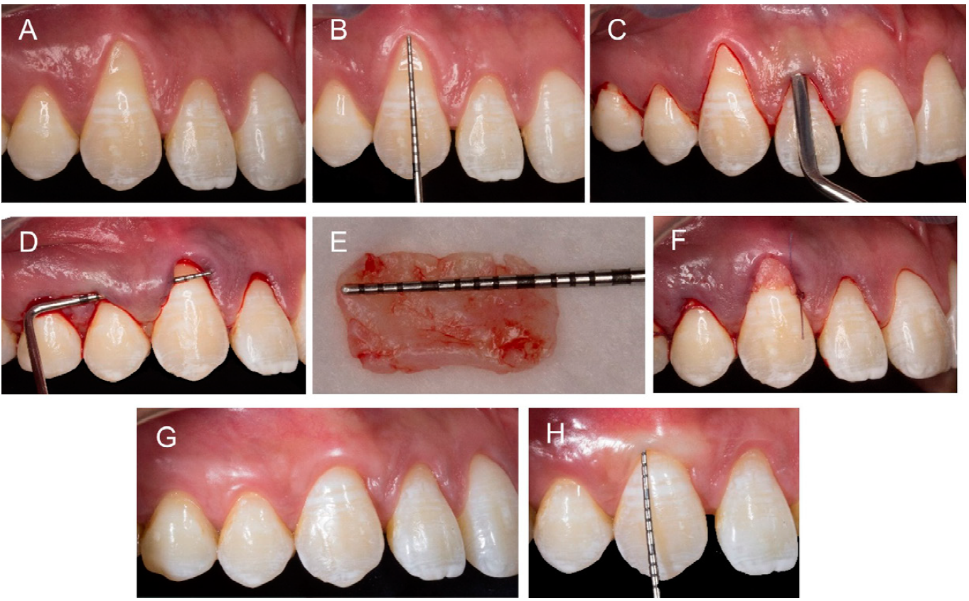 Figura 1 Secuencia del tratamiento del lado derecho. A. Fotografía inicial. B. Sondeo periodontal inicial. C. Incisiones y preparación del lecho receptor. D. Presentación del túnel. E. Injerto de tejido conectivo subepitelial. F. Adaptación del injerto por debajo del túnel. G. Fotografía final a los 4 meses. H. Sondeo final.