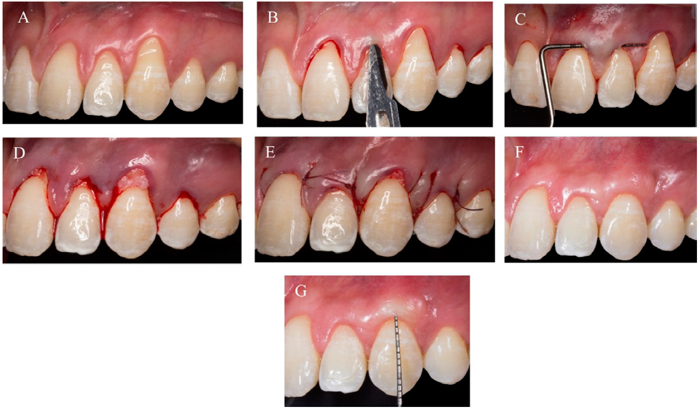 Figura 2 Secuencia del tratamiento del lado izquierdo. A. Fotografía inicial. B. Incisiones y preparación del lecho receptor. C. Presentación del túnel. D. Adaptación del injerto por debajo del túnel. E. Sutura. F. Fotografía final a los 4 meses. G. Sondeo periodontal final.