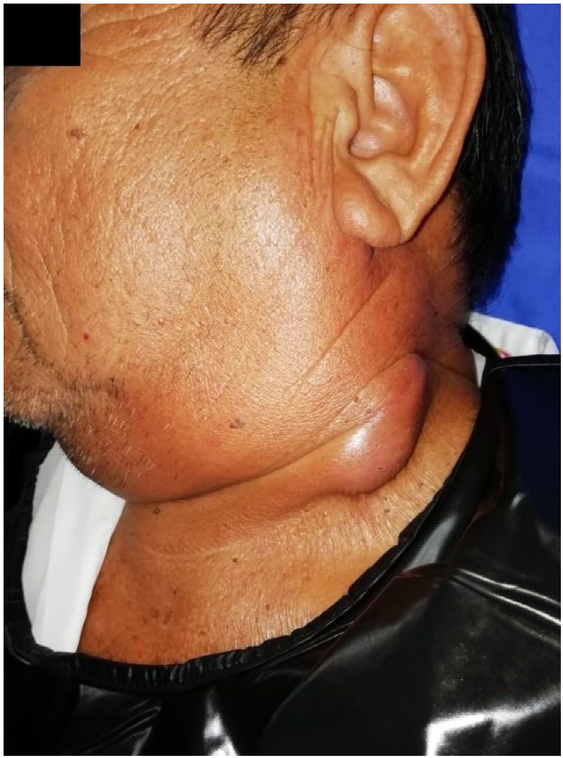Se presentó un paciente masculino de 69 años, nacido y residente en una comunidad maya del Estado de Yucatán, maya-hablante, agricultor y apicultor. Acudió a la clínica de endodoncia para valoración y tratamiento de los dientes 32 (con corona fenestrada) y 33, ambos sintomáticos a la oclusión. En antecedentes médicos refirió no ser diabético (se le realizó monitoreo de glucemia con dispositivo Accu-Chek®, obteniendo 102 mg/dL), ni hipertenso (se tomó presión arterial con monitor de presión arterial digital de brazo OMRON®, teniendo 110/80 mmHg). Como hábitos perniciosos, manifestó tabaquismo y alcoholismo durante su juventud y adultez. Mencionó estar bajo tratamiento analgésico con tramadol y paracetamol, una tableta cada 12 horas debido a dolor de masa indurada en la región cervical izquierda (Figura 1), asimismo, con otitis media crónica y otorrea crónica, sin dolor ni fiebre. Se palpó con los dedos índice y medio la cadena ganglionar cervical izquierda, que presentó aumento de volumen, indurada, eritematosa, hipertérmica, no móvil y aparentemente fija a planos profundos, extendiéndose hasta el área submandibular y preauricular de la región ganglionar cervical. El ojo izquierdo parcialmente cerrado. Manifestó odinofagia leve y disfagia. Paciente y familiares ignoran su condición médica referente a la masa indurada. Se observó higiene oral aceptable, con ausencia de algunos dientes mandibulares posteriores. Presencia de corona fenestrada, con filtraciones y mal ajustada en el diente 32; y el diente 33 con atrición en borde incisal y abfracción en área cervical. Para la presente publicación se solicitó autorización escrita por medio del consentimiento informado y voluntario, obteniendo una respuesta aprobatoria de parte del paciente.