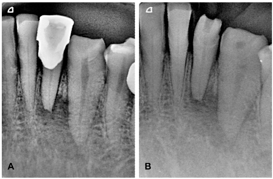 Figura 2 Radiografías dentoalveolares de los dientes 32 y 33. A. Radiografía preoperatoria de los dientes 32, con corona fenestrada, y 33. B. Radiografía postoperatoria, donde se colocó medicación intraconducto de Hidróxido de Calcio químicamente puro y ionómero de vidrio como obturación coronal provisional.