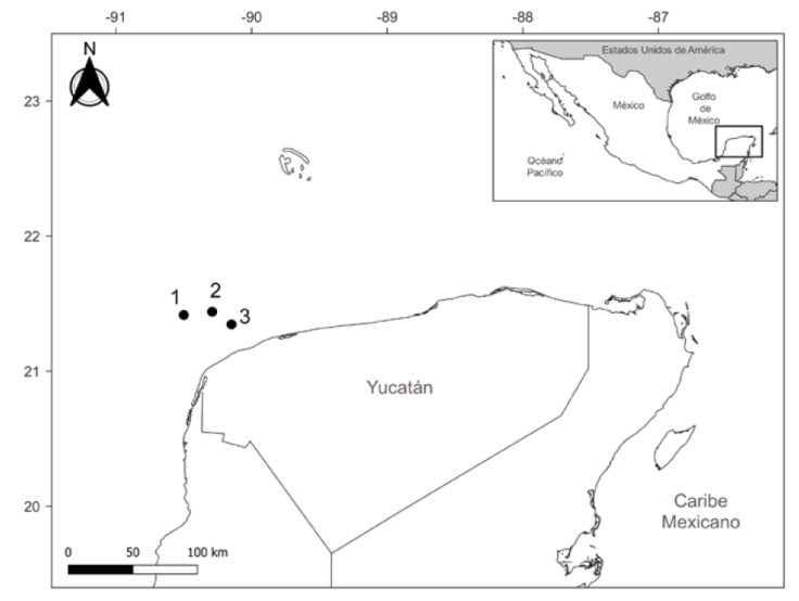 Los arrecifes explorados fueron Bajos de Diez, Madagascar y Serpientes, los cuales pertenecen al Sistema Arrecifal Sisal, Yucatán (Fig. 1). Todos ellos son someros y presentan un fondo mayormente carbonatado (Zarco-Perelló et al., 2013). Están ubicados al noroeste de la península de Yucatán entre las coordenadas 21°20’ N, 90°14’ O y 21°14’ N, 89°50’ O (Winfield et al., 2020).