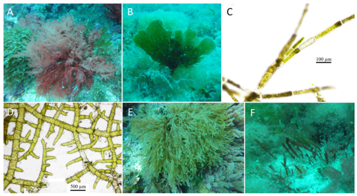 Figura 2 Fotografías de 6 de las macroalgas que integran el listado presentado, 5 de ellas corresponden a los nuevos registros. A, Platoma gelatinosum; B, Udotea abbottiorum; C, Cladophora prolifera; D, Microdictyon marinum; E, Dictyota dichotoma; F, Corynomorpha clavata.