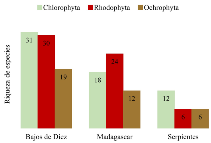 De acuerdo con los resultados, las algas rojas son el grupo taxonómico con mayor número de especies, su predominancia en ambientes insulares, costeros y lagunares tropicales es algo común, y ya reportado por varios autores para las costas de Yucatán (Dreckmann, 1998; Ortegón-Aznar y León-Tejera, 2022; Pedroche y Sentíes, 2020). A nivel de familia, los datos también son coincidentes con lo que existe en la literatura para la zona (Dreckmann, 1998; García-García et al., 2022; Mendoza-González et al., 2016; Ortega et al., 2001; Ortegón-Aznar y León-Tejera, 2022; Pedroche y Sentíes, 2020; Vilchis et al., 2018) y específicamente para ambientes insulares (González-Solis et al., 2018); Caulerpaceae, Halimedaceae, Dictyotaceae y Rhodomelaceae son las familias con mayor riqueza específica. En cuanto a las macroalgas que habitan los arrecifes, en Bajos de Diez y Serpientes se registraron más clorofitas, mientras que en Madagascar rodofitas. La predominancia de las algas verdes en los 2 primeros arrecifes probablemente puede estar correlacionado con el tipo de sustrato presente en ellos, ya que sus estructuras coralinas y rocosas segregadas promueven la existencia de fondos carbonatados y grandes llanuras arenosas, que son donde las algas verdes encuentran mejores condiciones para su desarrollo y distribución. En consecuencia, esto también explicaría el hecho de que Caulerpaceae y Halimedaceae son las familias con más representantes en estos arrecifes, al establecerse las especies de la primera preferentemente en suelos arcillo-arenosos, y en carbonatados las de la segunda, al ser fijadoras de calcio en su pared celular (Garduño-Solórzano et al., 2005).