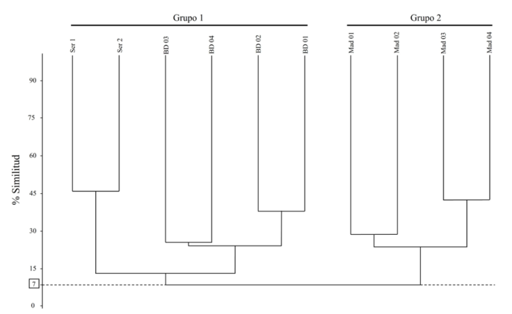 Figura 5 Fenograma resultante del análisis de agrupamiento. Los nombres en cada rama terminal son las abreviaciones empleadas para nombrar y numerar las estaciones muestreadas en cada arrecife. BD: Bajos de Diez; Mad: Madagascar; Ser: Serpientes. La línea punteada señala el porcentaje de similitud entre los 2 grupos principales formados en el fenograma.