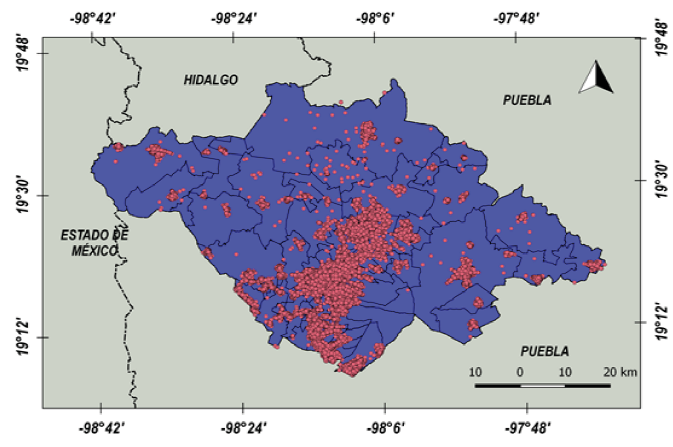 De acuerdo con el Plan Estatal de Desarrollo de Tlaxcala (2022), en la región centro de Tlaxcala se localiza una gran cantidad de empresas, las que se examinan en esta investigación. La región está integrada por 22 municipios (véase Figura 1). Ahí se localizan tres de los municipios con la mayor concentración de PYMES y población considerable. El municipio de Apizaco alberga 32% de las PYMES y tiene una población de 80 725 habitantes; Tlaxcala contiene 28% de estas empresas y habitan 99 896 personas y Chiautempan posee el 14% de estas unidades económicas y tiene 73 215 habitantes (Instituto Nacional de Estadística y Geografía [INEGI], 2020 y 2023).