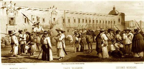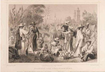 Figura 8 Johann Moritz Rugendas dibujó (G.M.Kurz grabó), «Soldados (cívicos) de Tierra Caliente y fruteros», en Mexiko und die mexicaner o Mexiko, 1855