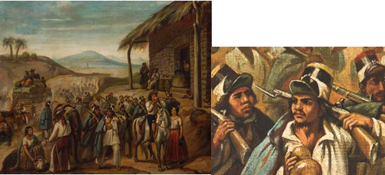 Pero en general Castro mantiene su imagen dentro de un margen de decoro, pues al contrario de lo expresado en las críticas, ha omitido mostrar la semidesnudez y el desaseo de sus personajes -lo mismo ocurrió en las otras láminas del álbum-. Esta relativa contención se percibe mejor si se compara con un cuadro al óleo conservado en el Museo Nacional de las Intervenciones (véase figura 4) que retrata a varios soldados liberales vestidos improvisadamente, algunos sin camisa y con la ropa hecha andrajos.43 En cuanto a Castro, incluso ha conferido a los animales buen aspecto, aunque en su novela Juan A. Mateos (s.f.: 29) refirió que sus caballos estaban flacos y sus monturas envejecidas.