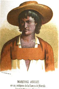Conviene subrayar que la característica más significativa que Castro ha borrado en la fisonomía de sus personajes es el estigma en la piel por el mal del pinto,44 a pesar de que se ha señalado la altísima prevalencia de la enfermedad entre las tropas de Álvarez (Zamacois, 1855-1856: 28; Mateos, s.f.: 29), y muy en particular entre la citada fuerza de Villalva, que en buena parte provenía de la región del Mezcala (Belarmino Fernández, 2013: 11), zona muy afectada por la enfermedad, a tal grado que un estudio médico publicado décadas después se ilustró justamente con la imagen de un lugareño de la región con notorias afectaciones cutáneas (véase figura 5).