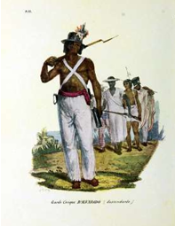 En cuanto a la imagen de los surianos, quizá Castro eludiera deliberadamente la representación de la negritud, como hizo con las manchas en la piel, pues, aunque fue ampliamente reconocida la ascendencia africana de muchos soldados del sur, en su imagen no es visible. No obstante que el cabello de algunos parece crespo51 o su nariz ancha, ni su cara ni su color los distinguen de otros tipos étnicos representados en el resto del álbum, por ejemplo, indígenas. Esta ambigüedad resalta si se contrasta con dos imágenes de tropas afines donde la afrodescendencia es clara: «Garde Civique D’Alvarado, descendante», del italiano Claudio Linati publicada en 1828 (véase figura 6), o «Soldados de la Brigada Roja, partidarios de Juárez», acuarela pintada entre 1858 y 1860 en Veracruz por el suizo Johann Salomon Hegi.