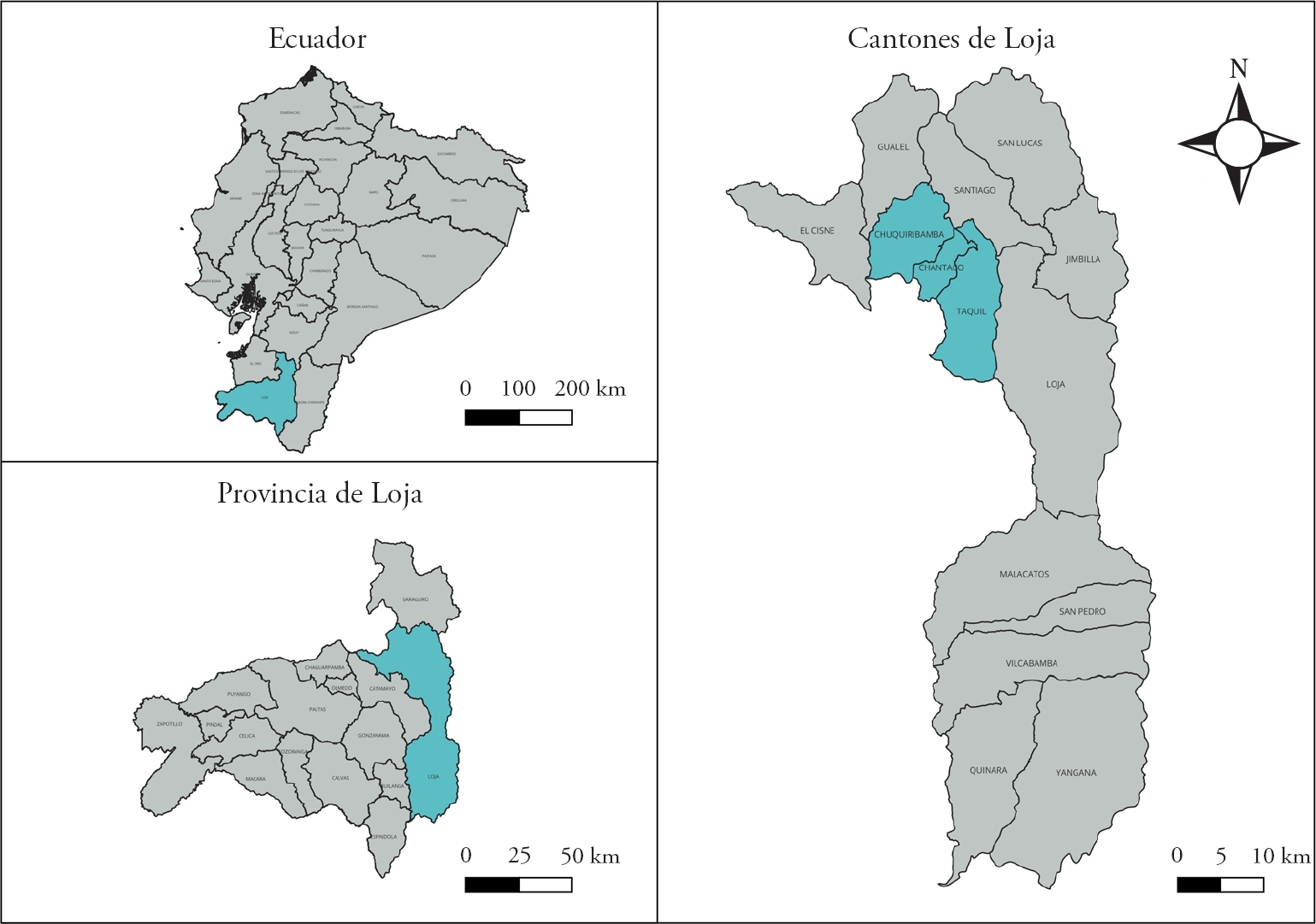 El trabajo, se desarrolló en la provincia de Loja (Figura 1), en un área rural de Taquil, Chantaco y Chuquiribamba, caracterizadas por tener suelos fértiles. La amplitud del intervalo altitudinal, va de 1,180 a 2,230 m sobre el nivel del mar. Con clima frío, temperatura media anual de 15 °C, precipitación de 680 mm al año. Su economía, se basa en la agricultura, con producción de cultivos tradicionales, como el maíz y cebada y gran variedad de hortalizas; la producción obtenida, es destinada a la venta, en varios sectores de las provincias de Loja, El Oro y Guayas (Gobierno Autónomo Descentralizado de Chuquiribamba, 2011).